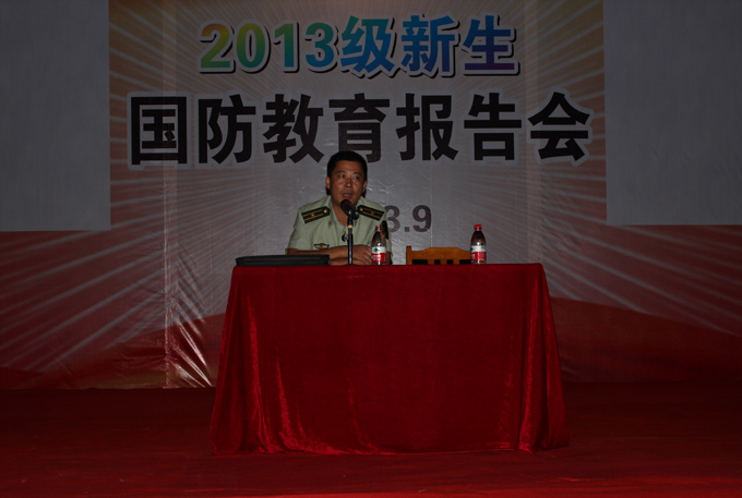 9月18日晚,我校在灯光篮球场举行2013级新生国防教育报告会,报告会由河源市武警支队教导员曾建军主讲,以“‘中国梦’是‘强军梦’,伟大民族必有强大的军队”为主题,和新生们交流了有关国防教育的知识。
