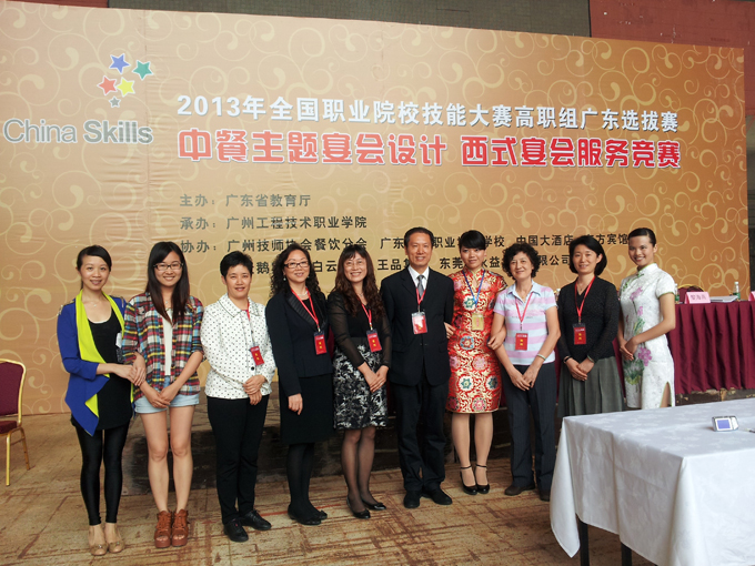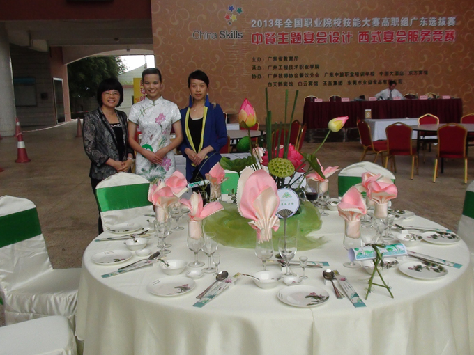 2013年全国职业技能大赛高职组广东选拔赛“中餐主题宴会设计”竞赛由广东省教育厅主办、广州工程技术职业学院承办,共有来自全省27所高职院校的44支代表队参赛。比赛共由理论考核、外语口语水平测试、实践操作和主题阐述四个部分组成。其中实践操作考察选手的职业形象和礼仪及动手操作能力,包括选手的熟练性、规范性、美观性,仪容仪表是否符合行业的基本要求及岗位要求;也考察选手的主题宴会设计能力及构思,立意是否创新,创意是否独特,台面是否丰富,是否有强烈的美感。