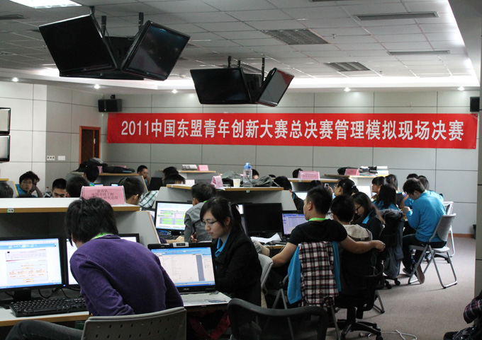 中国东盟青年创新大赛管理模拟决赛现场,这里云集了18支队伍。“力城”队经初赛、复赛,从1900多支队伍中脱颖而出,最终夺得金奖。