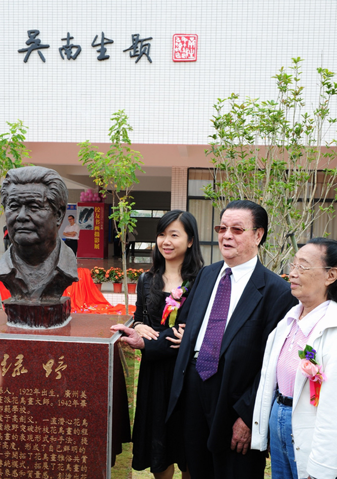我校杰出校友、广州美术学院教授叶绿野及其家属 在叶绿野艺术楼及其铜像前合影