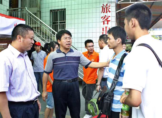 正午时分,刘安华校长和陈农心副校长亲自赶赴汽车总站现场,亲切地慰问了志愿者,并对新生以及家长表示热烈的欢迎,他们希望新生们能尽快融入校园生活。在现场,刘安华接受了记者的采访,他高度赞扬了志愿者的工作和服务态度,对他们的新生接待服务工作非常满意,同时他强调一定要做好财产安全保障工作,确保新生财产的安全。
