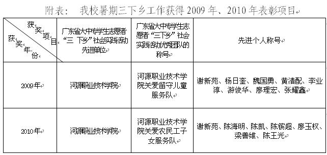 近日,中共广东省委宣传部、广东省精神文明建设委员会办公室、广东省教育厅、共青团广东省委员会、广东省学生联合会联合下发团粤联发[2011]50号和团粤联发[2011]51号文件,表彰2009年和2010年全省大学生暑期“三下乡”社会实践活动先进。我校连续两年获得殊荣。