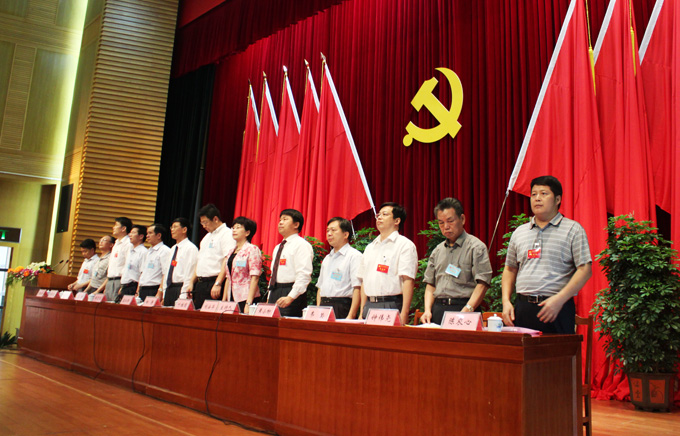 在党徽和红旗的映照下,与会代表胸佩鲜红的代表证,庄严步入会场。大会在雄壮的国歌声中正式开幕。