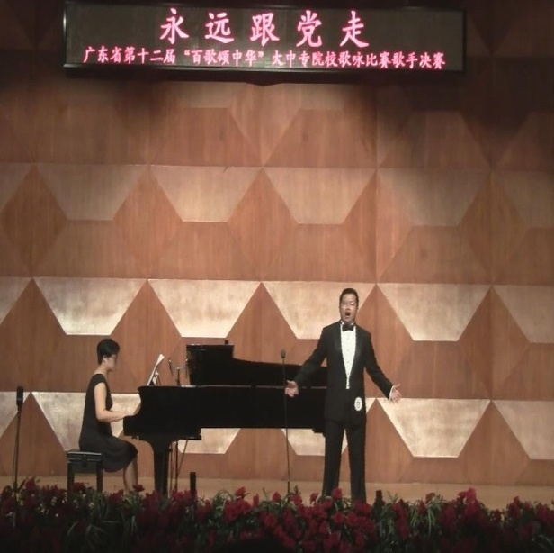 为庆祝中国共产党成立95周年,深入学习贯彻落实习近平总书记在文艺工作座谈会上的重要讲话精神,唱响中国梦,传递正能量,讴歌党的丰功伟绩,坚定爱国爱党的信念,弘扬社会主义核心价值观,根据广东省委宣传部《关于举办“永远跟党走——广东省第十二届‘百歌颂中华’大中专院校歌咏比赛”活动的通知》的要求和安排,广东省教育厅在全省大中专院校范围内开展“永远跟党走——广东省第十二届‘百歌颂中华’大中专院校歌咏比赛”活动,活动由广东省教育厅主办,星海音乐学院具体承办,评委老师由国家一级演员李素华、女高音歌唱家,星海音乐学院教育学院副院长皮晓彩教授、华南师范大学音乐表演系主任丁义教授和著名男高音歌唱家乔建军等十多位专家组成。本次歌手比赛全省共有100余所高校派出代表参加,经过2016年7月4日第一轮碟选,选出了前30名选手进入7月15日总决赛。其中,我校刘颂章老师是全省前30名选手之一。