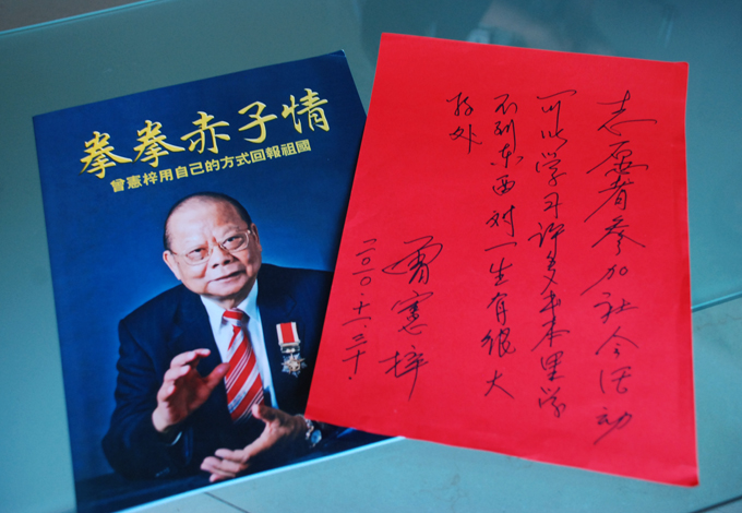 “志愿者参加社会活动可以学习许多课本里学习不到的东西,对一生有很大好处”曾宪梓博士在离开河源前给志愿者留言提到。