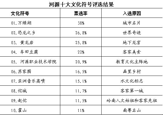 据统计,共有4000多名师生参与了调查,其中38%的参与调查者认为万绿湖最能代表河源文化,应成为河源的文化符号。排在第二位的是“恐龙之乡”,有26.8%的票选率。