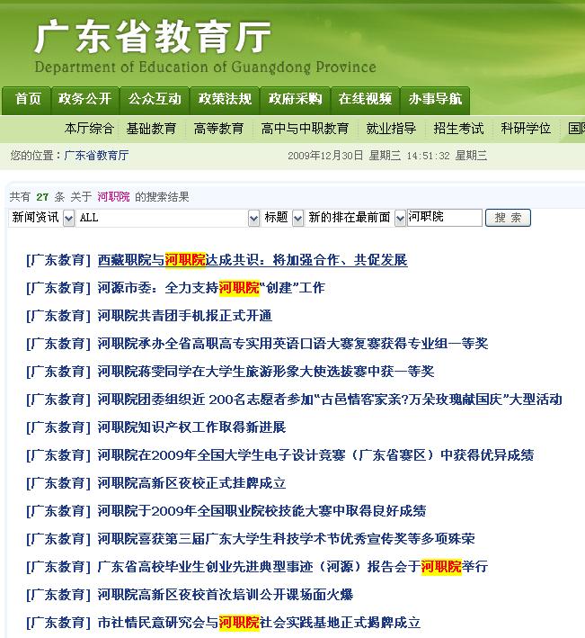 师生可通过登录广东省教厅主页:http://www.gdhed.edu.cn/main,并搜索关键字“河职院”查看新闻。