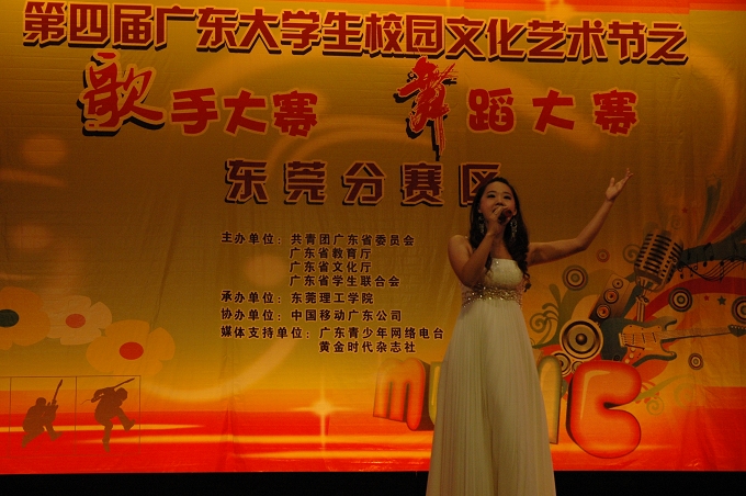 11月14日,第四届广东大学生校园文化艺术节之歌手大赛(东莞分赛区)在东莞理工学院大礼堂圆满结束,来自我校艺术与设计学院的陈佳珊同学在比赛中脱颖而出,喜获一等奖,她也将代表东莞赛区参加全省总决赛。