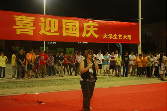 9月25日晚,我校大学生艺术团在灯光篮球场举行了一台以“艺术传承 喜迎国庆”为主题的文艺晚会。晚会洋溢着喜庆的气息。由声乐队带来的独唱《美丽的心情》拉开了晚会的序幕,本次晚会的节目多样、精彩绝伦、赢得了我校新生们的阵阵掌声。有激情四射的街舞表演,有犹如天籁之音的《那片海》掀起了晚会的高潮,有西域风情的舞蹈《欢乐跳》,还有优美的手语表演。晚会以献给伟大的祖国60华诞的歌曲《祖国,你好!》落下了帷幕。愿我们伟大的祖国长治久安、天下太平。