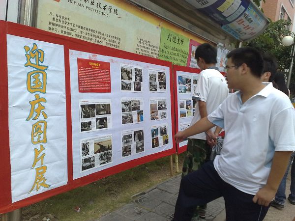 为庆祝中华人民共和国60华诞的到来,我校团委在学校宣传栏开展了以“祖国光辉的六十年”为主题的迎国庆图片展活动。