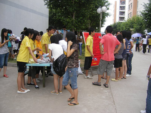 9月20日,我院青年志愿者协会在A、B宿舍门口空地招募服务汽车总站以及笔架山环保活动的志愿者,此次活动共招募了235名志愿者,其中有6名意愿作为流动志愿者。