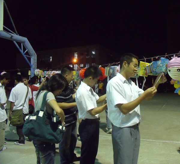 据悉,5点30分,“新芽人”用铁丝在灯光篮球场上拉起了一个六边形,并在上面挂起250多盏早已贴好了谜面的灯笼。此次活动的灯谜内容有谜语、IQ题、历史常识问答题、成语接龙、文学常识问答题等。可爱的灯笼和丰富的题目还有神秘的礼品吸引同学们积极地参与,原定于7点30分开始的活动提前了半个多小时开幕。同学们发挥自己的聪明才智,用自己的智慧把粘贴在灯笼上的谜面一个个取了下来。按照活动规则,同学们只要猜对三个谜面,即可获得新芽文学社送出的,由one two three汉堡奶茶店和贵族•经典剪吧提供的礼品一份。活动的高潮持续了2个多小时,期间,不管是灯笼下还是兑奖台前都被同学们里三层外三层的包围住了。新芽人提供的6000个谜面被解开了谜底,900多份礼品也在10点的钟声敲响之前悉数被同学们收入囊中。