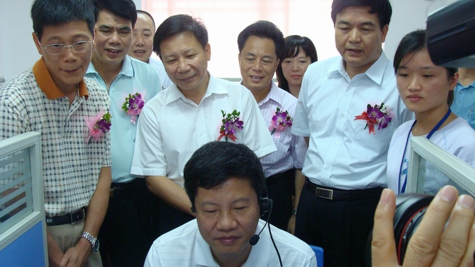 揭牌仪式后,市委书记陈建华等领导还参观了社情民意研究会电访调查室,现场观摩电话访问调查工作,陈建华书记还从电访员手中接过耳机亲自进行了一次电话调查访问。