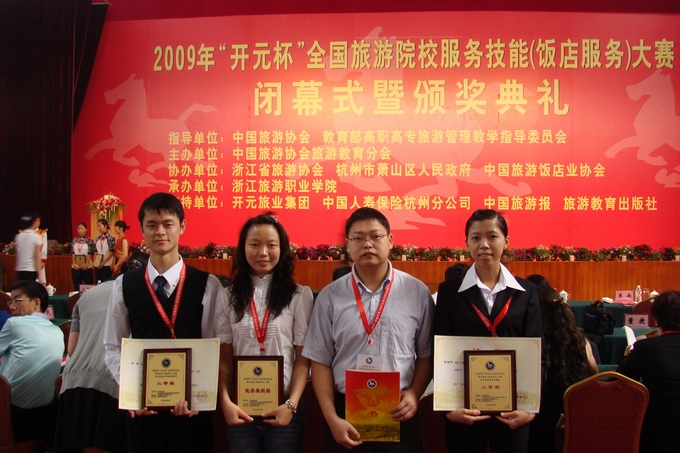 5月24日, 由教育部和国家旅游局指导,中国旅游协会旅游教育分会主办的2009年“开元杯”全国首届旅游院校服务技能(饭店服务)大赛落下帷幕。我校两名同学在大赛中均获二等奖。