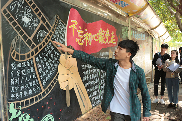 此次黑板报评比由各学生组织、二级学院的学生干部代表组成的评审组,秉承黑板报评比规则,本着公正、公平、公开的原则,从内容、版面设计、文字抄写、刊头、提花、小标题、解读六个方面分别对每幅黑板报进行了评比。在评比过程中,各学生组织、二级学院学生代表认真解说,对各自所设计的黑板报刊头、版面设计、图案构思、色彩搭配以及内容等方面进行详细讲解,与此同时,各学生组织、二级学院学生代表在讲解中虚心采纳了评委组的意见及建议。最终经评分统计,艺术与设计学院以平均分78.79荣获一等奖。