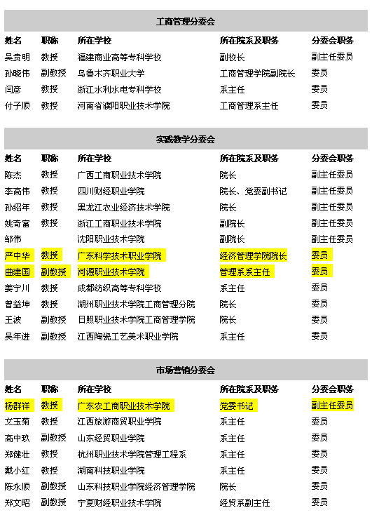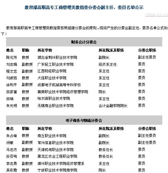2008年12月13日,教育部高职高专工商管理类专业教学指导委员会在该委员会的网上公布了教育部高职高专工商管理专业教学指导委员会分委员会委员名单,我校曲建国老师当选为教育部高职高专工商管理类专业教学指导委员会实践教学委员会委员。此次参加评选的有全国各高职高专院校的系主任(院长),还要部分学校校长或书记,评选工作由教育部高职高专工商管理类专业教学指导委员会负责组织。广东省有三所院校(广东农工商职业技术学院、广东科学技术职业学院和BTY.COM)其中的参选人员被成功评选为委员。(请见下表)。