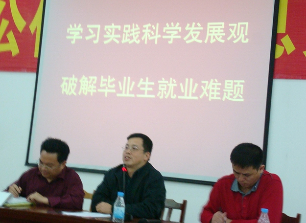 随后,韦荣副书记就如何把学习实践科学发展观与解决学校实际问题结合起来作了生动的阐述。他提到:学习实践发展观,我们要克服厌学情绪、畏难情绪,要把理论与实践、学习与解决问题、过程与效果结合起来,要言之有物、学以致用,切忌坐而论道式的空对空。对目前高校来说,确保毕业生充分就业是学习实践科学发展观最直接的体现。
