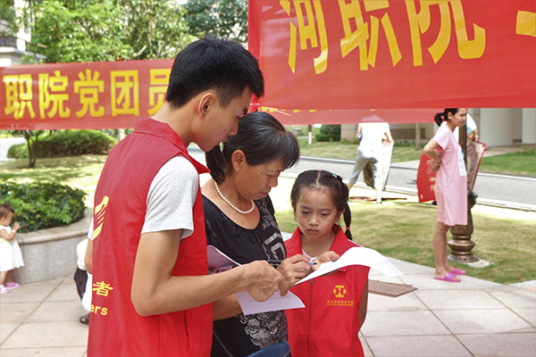 7月1日,在庆祝建党96周年之际,我校团委联合江东新区居委会于碧桂园开展创文宣传活动之志愿服务进社区活动。我校团委书记陈晓峰、校团委老师古伟民、学生志愿者代表参与了此次活动。