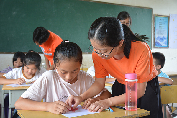 心中有绿,脚下留青;支教助学,尽心而为。在“三下乡”期间开展的义务支教活动,教育关爱帮扶队开设了语文素养、趣味数学、英语听说、舞蹈音乐、手工绘画、体育活动、素质教育以及红色教育八个课程,分设了绿叶班、花儿班和少年班三个班级。共有77名学生报名参加培训辅导。在禁毒防艾宣传队的协助下增加了关于“珍爱生命,拒绝毒品”的宣传课,加深了学生对毒品的认识,帮助学生树立“珍惜生命,远离毒品”的观念。此外,今年的义务支教增加红色教育课程,旨在培养学生的爱国主义情感,提高学生爱国爱党的思想觉悟。截止到支教活动开展的第四天,学生们共制作了127件作品。教育扶贫,支教先行。