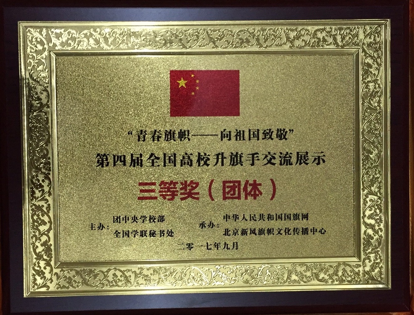 于此同时,在北京航空航天大学沙河校区举行的第四届高校升旗手交流展示评比中,我校国旗护卫队克服水土、饮食等困难,在比赛过程中,我校国旗护卫队展现了饱满的精神、熟练的动作,良好的训练水平。通过升旗动作、礼仪动作、升旗程序、国旗法规等十项目考核,我校国旗护卫队最终凭实力荣获全国三等奖。