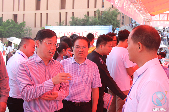 10月26日,我校在图书馆门前广场举办2018届毕业生河源企业专场校园招聘会。市委常委、副市长、深圳对口帮扶河源指挥部总指挥、市高新技术开发区党工委书记王卫在我校党委书记韦荣、校长陈德清、副校长陈农心等领导陪同下,亲临招聘会现场,了解企业的人才需求和毕业生应聘情况,对我校加强政校企合作,促进就业的做法给予充分的肯定。