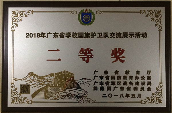 为深入贯彻落实党的十九大关于加强全民国防教育的决策部署,开展“传承红色基因,坚定理想信念”主题教育活动。5月12日至13日,2018年广东省学校国旗护卫队交流展示活动于广东医科大学东莞校区体育馆隆重举行。我校国旗护卫队赴广东医科大学参加此次交流展示活动,并在活动中荣获“团体项目二等奖”荣誉。