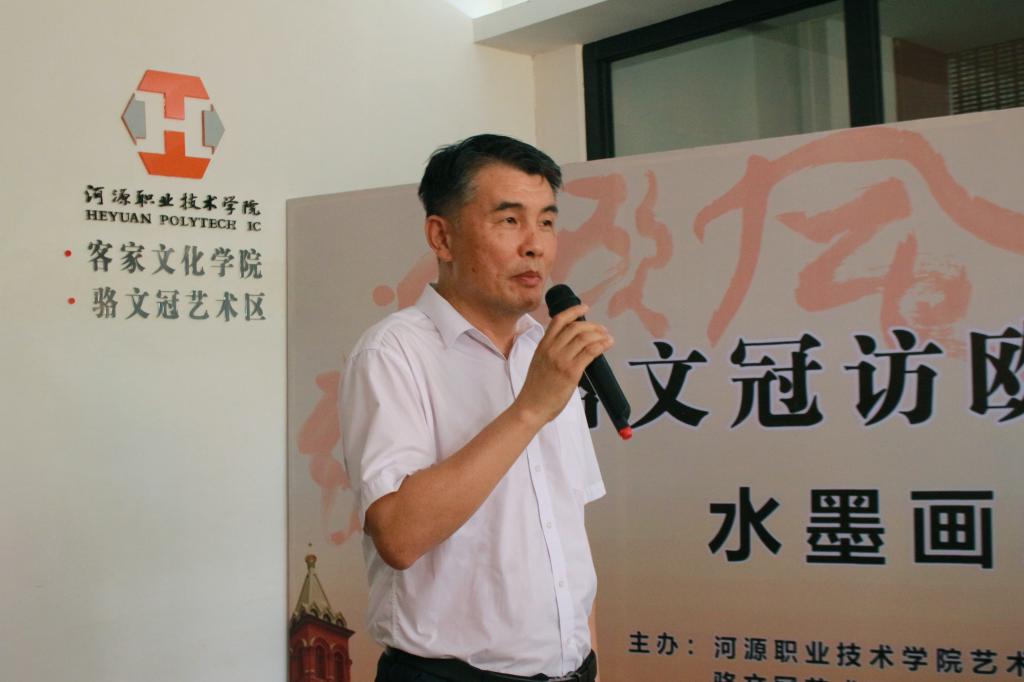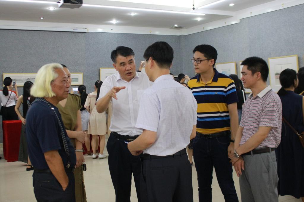 最后,陈德清校长宣布水墨画展正式开幕,骆文冠先生引领嘉宾观赏画作,并进行详细的讲解。