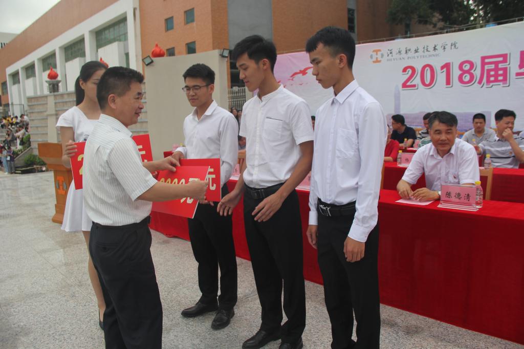 在典礼上,对2018届的218名优秀毕业生进行表彰,党委书记韦荣为优秀毕业生代表颁奖。同时,对在2018年全国职业院校技能大赛中荣获全国一等奖、二等奖的同学进行表彰。唐汉芳副校长、叶国英副书记分别为一等奖3名获奖学生、二等奖10名获奖学生颁奖。