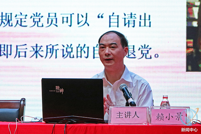 讲座中,赖小景副校长从中国共产党在建国前的历史概况、党的一大至十九大的历史史实以及党的历史中吸取智慧和总结经验,阐述了“尊崇党章,严守党纪,争当新时代先锋战士”的主题精神。他强调,身为一个合格的党员,必须时刻加强自己的党性修养,把握党的正确方向,立足岗位,坚持宗旨,奉献社会。