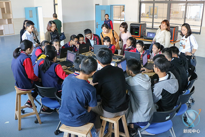 随后,专家代表前往北大附属德爱国际学校参观交流。在北大附属德爱国际学校的师生陪同下,领导及专家代表到合一楼、steam课程中心、比特实验室、禁毒宣传室等地参观,观摩了手工课、地理课、书法课、英语课等现代化信息技术课堂的教学模式。北大附属德爱国际学校为来宾准备了文艺表演,包含舞蹈、歌舞剧、相声、武术、传统国学等内容,向参观代表展示了该校的办学育人成果。