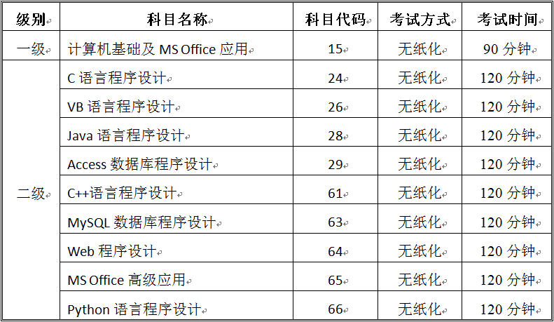 2019年上半年全国计算机等级考试开考科目(BTY.COM考点)