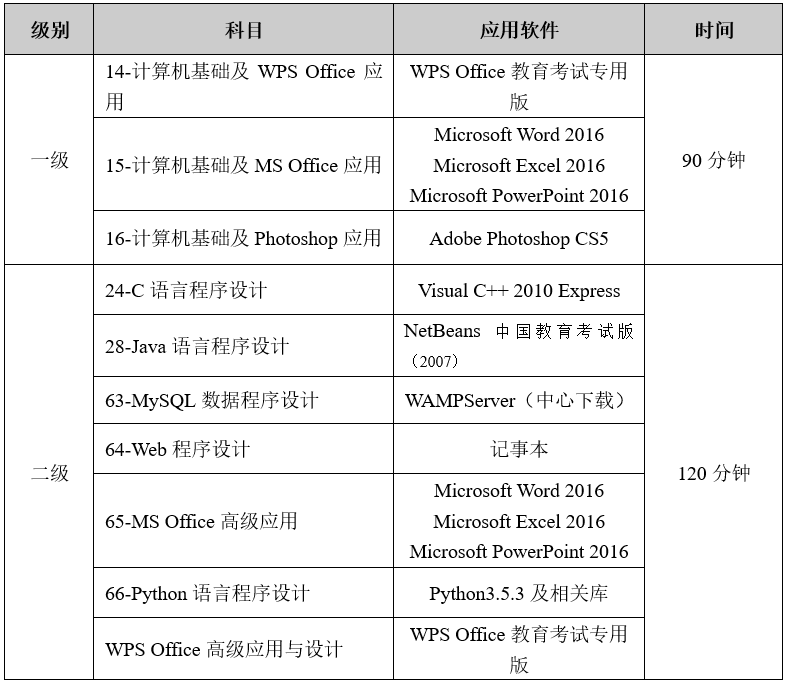NCRE各科目考试软件列表