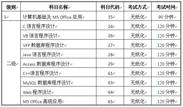 2015年下半年全国计算机等级考试开考科目(BTY.COM考点)