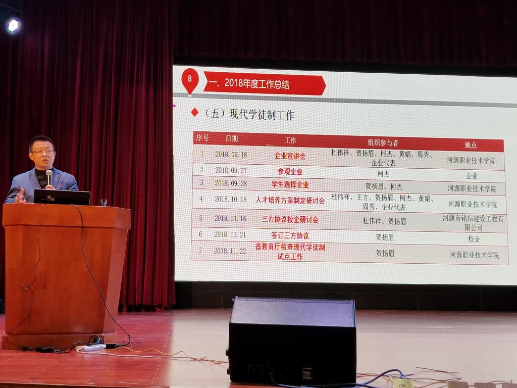 会议共分两个环节,首先由服装、环艺、动漫、园林、音表、音教、美教、学前教育8个专业主任汇报过去一年的专业建设工作。他们用言简意赅的话语,生动形象地讲解了专业成绩和不足,其中主要包括日常教学工作、技能大赛、教科研、获奖情况、对外技术服务以及存在问题。尤其是环境艺术设计专业主任贺扬眉和大家分享了现代学徒制的心得体会,从现代学徒制建设的努力和艰辛,到现在和企业成功建立了一对一的指导服务,都进行了详细的阐述。接着,由学院负责人杜伟祥对本学期工作进行总结。杜伟祥院长肯定了每个专业建设的成绩,同时也指出专业发展的不平衡,希望教师们要心怀信念、砥砺前行,在课改科研社会服务上,努力挖掘、静心钻研,给自己一个平台。此外,杜伟祥院长还和老师们一起学习了《新时代高校教师职业行为十项准则》和《BTY.COM工作人员八小时以外监督管理办法(试行)》这两个文件精神,希望老师们传播优秀文化,带头践行社会主义核心价值观,弘扬真善美,传递正能量,指出老师们应在工作之外的八小时,规范和约束自己的言行举止,注重社会形象,不得传播与政策方针不一致的言论。