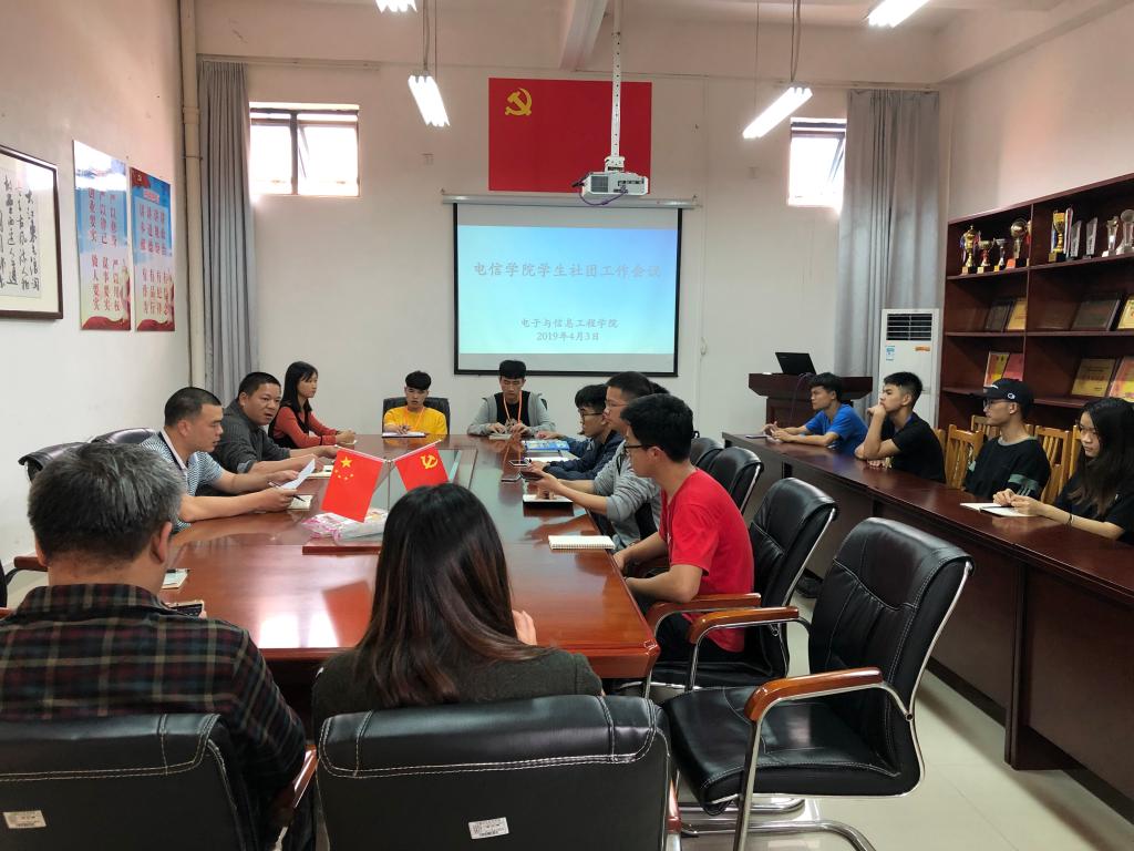4月3日下午,电信学院在实训楼A208召开学生社团工作会议。参会人员有:电信学院党(总)支徐国辉副书记、协会指导老师、各协会会长、协会学生代表,会议由学院团总支书记杨日奎老师主持。
