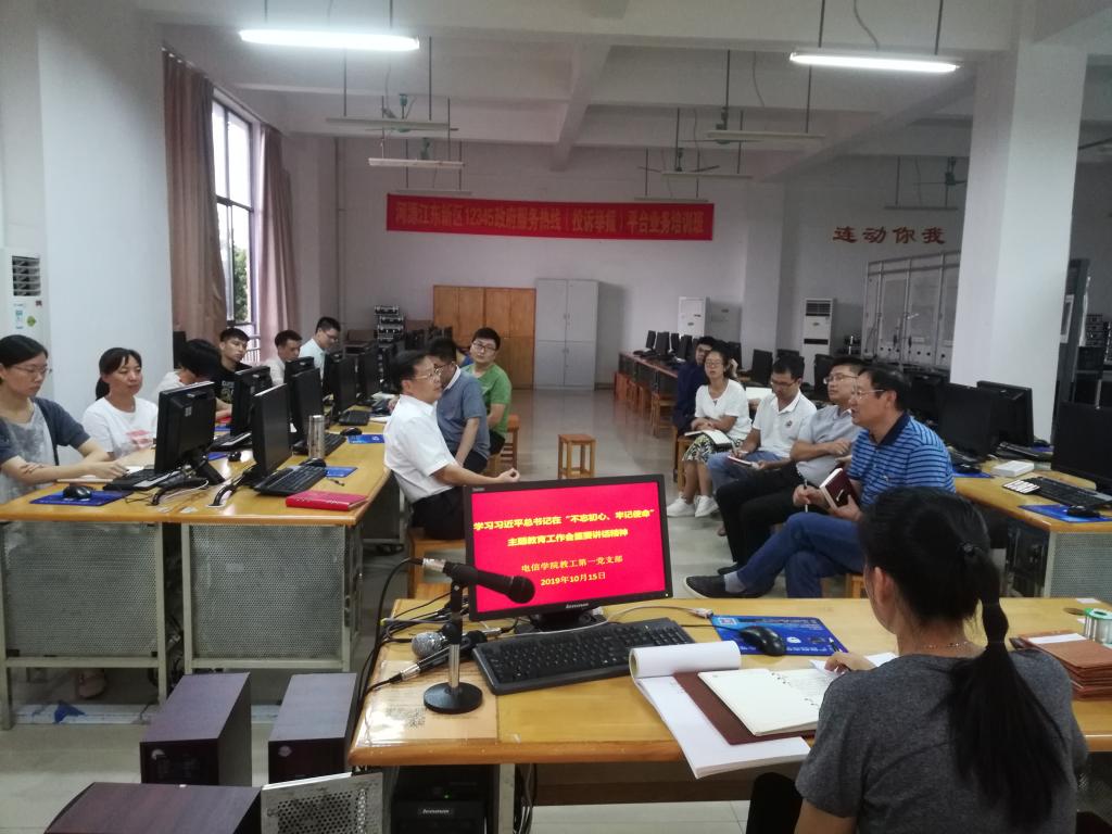 为了进一步推动学校“不忘初心、牢记使命”主题教育深入开展,对照《BTY.COM关于开展“不忘初心、牢记使命”主题教育实施方案》,结合本支部实际情况,电信学院教工第一党支部于10月15日下午召开党员大会,共同学习习近平总书记关于“不忘初心、牢记使命”主题教育工作会议重要讲话精神。学校党委韦荣书记作为支部成员参会,电信学院教工第一党支部全体党员参加会议。