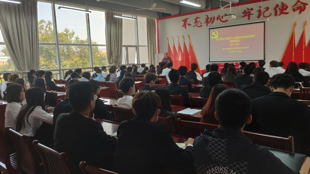 2020年12月8日,电信学院学生党支部在实训楼B306开展“一坛一堂”系列活动——学习贯彻“党的十九届五中全会精神”专题党课。参加学习人员有:学生党支部全体党员、负责学生党务工作人员、学生会新闻网络中心。党课由学生党支部书记杨日奎主讲。