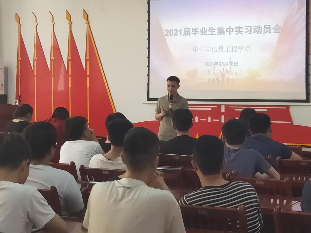 会上,实习指导老师向同学们介绍了企业相关的信息,对实习工作的具体内容和住宿生活方面进行了详细的介绍,明确毕业实习的方式、管理指导要求、须遵守的相关规定,强调了确保实习安全的重要性,提醒同学们保管好自身贵重财物以及避免与公司其他员工发生冲突与矛盾。