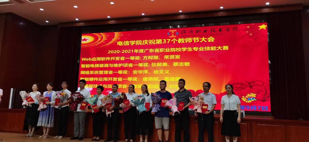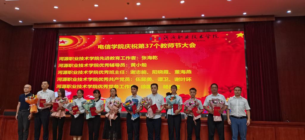 赓续百年初心,担当育人使命。以庆祝教师节活动为契机,深入学习贯彻习近平总书记在庆祝中国共产党成立100周年大会上重要讲话精神,系统展示我院在教育教学方面取得的丰硕成果,集中展示广大教师爱党爱国、仁爱奉献的精神风貌,为团结凝聚广大教师更好担负起立德树人根本任务,向全面建成社会主义现代化强国的第二个百年奋斗目标迈进提供坚强的政治保障和组织保障。2021年9月7日,我院在学术交流中心报告厅隆重举行第37个教师节庆祝大会。袁光华副校长、行政处室代表:欧阳玉娟处长、戴佰阳处长、曾广生副处长、周文副馆长、蔡鹏副主任,电信学院全体教职工及学生代表参加了会议,会议由学院党(总)支部书记王富宽院长主持。