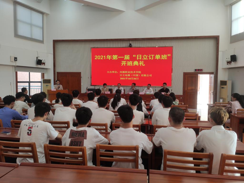 10月26日下午,我校在行政楼C108与日立电梯(中国)有限公司合作举行了第一届“日立订单班”开班典礼,电信学院院长王富宽、副院长周永福,日立公司总公司潘智弘科长,深圳分公司卜晶晶部长,惠州分公司蔡乃赞部长以及第一届“日立订单班”的全体学员及师生代表参加了开班典礼。开班典礼由电信学院校企办主任高燕主持。