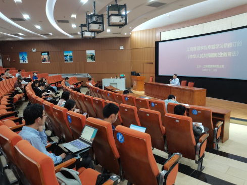 5月10日,工商管理学院在学术交流中心一楼3D导游实训室召开全院教职工大会,专题学习新修订的《中华人民共和国职业教育法》,学院党总支书记俞彤主持学习。