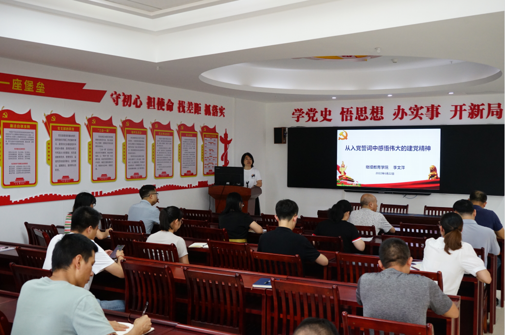 (一)专题党课:党总支书记李文萍同志以《从入党誓词中感悟伟大的建党精神》为题,从建党以来入党誓词的变化、入党誓词闪耀着伟大建党精神总结、永远把伟大建党精神继承下去、精神代代相传等几个方面带领大家从入党誓词中感悟伟大的建党精神,提出党员教师要坚定“革命理想高于天”的崇高信仰、激发“敢教日月换新天”的奋斗精神、锤炼“打铁必须自身硬”的政治品格。