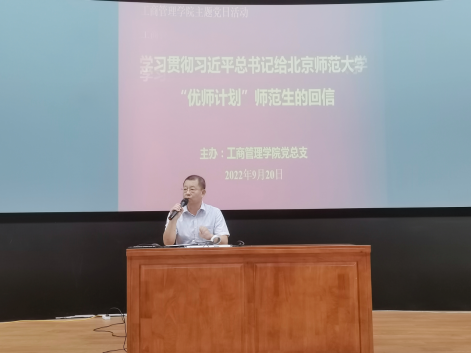 9月20日下午,工商管理学院党总支组织全院教职工在学术交流中心一楼3D导游实训室开展主题党日活动,专题学习习近平总书记给北京师范大学“优师计划”师范生重要回信精神。学习会由学院党总支副书记邹东平主持,学院党总支书记俞彤领学。