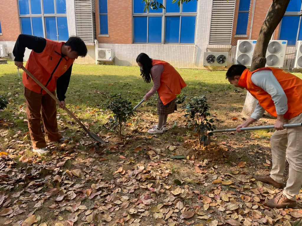在植树复绿现场,大家分工协作:有的帮忙疏松泥土、有的给树浇水、还有的清扫实训楼外围树叶,互相配合,气氛融洽。