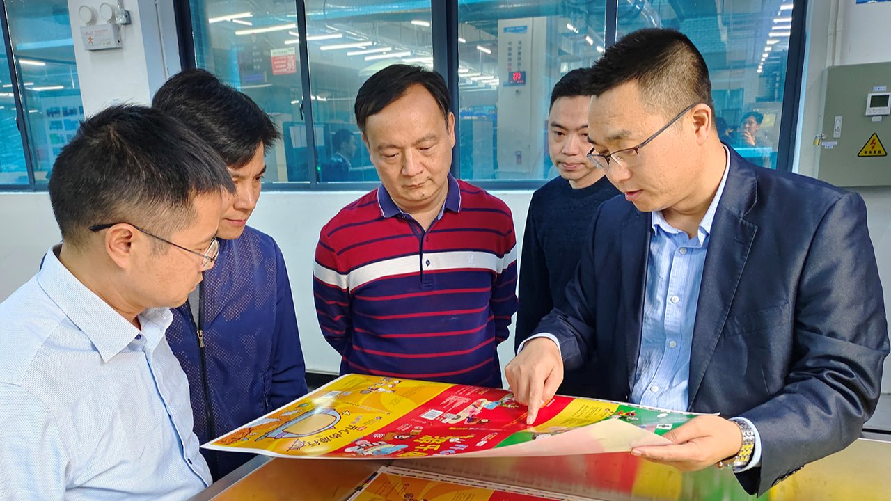 金宣发公司总经理杨卫东、副总经理吴文全等热情接待钟建坤院长一行,并带领大家参观展厅和印刷车间。吴文全副总经理对展厅的产品印刷工艺与包装设计进行详细的介绍,在参观印刷车间的过程中,还介绍了企业自主研发的生产设备与印刷的工艺流程。