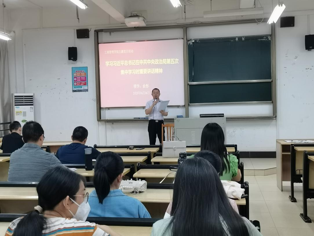 6月6日下午,工商管理学院党总支组织全院教师在教学楼D204开展主题党日活动,深入学习习近平总书记在中共中央政治局第五次集中学习时重要讲话精神。本次学习由学院党总支书记俞彤领学。