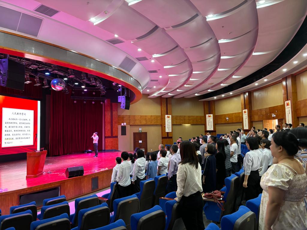 然后在杜伟祥院长的带领下,全体教职工重温教师誓词,宣誓仪式热烈而鼓舞人心,更加坚定了老师们作为人民教师的那份责任与担当。