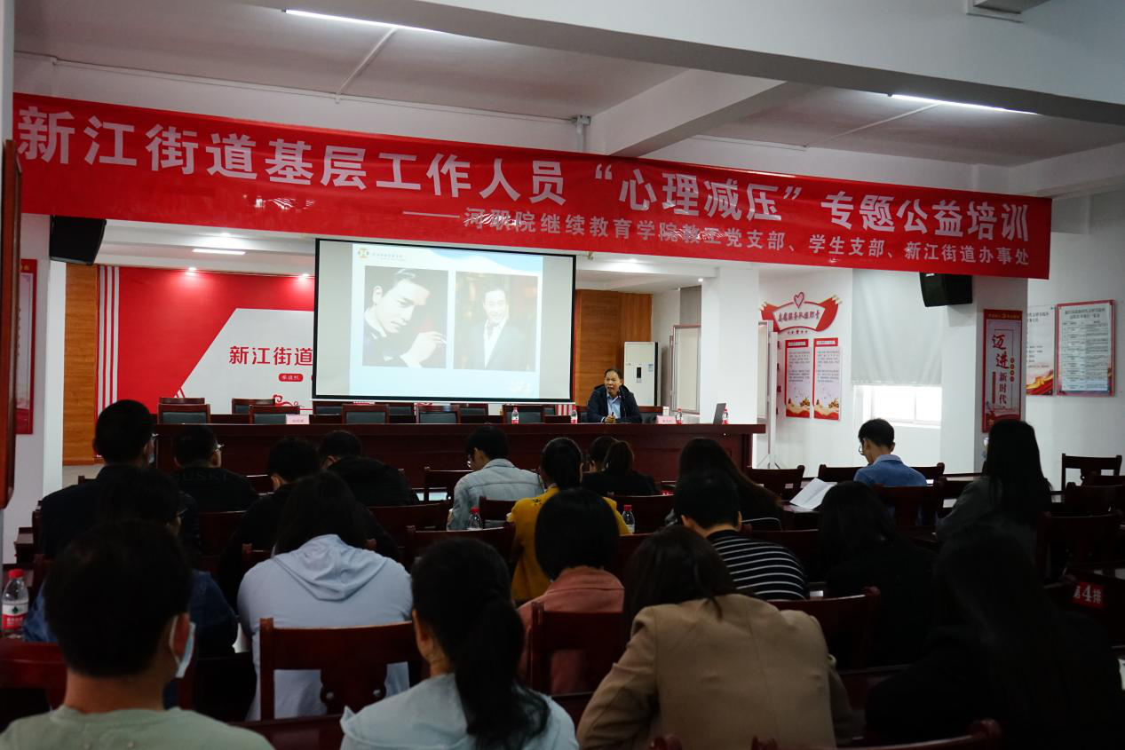 新江街道办事处及其所管辖的社区基层工作人员共35人参加了“心理减压”专题公益培训。新江街道办事处党委委员梁宽同志表示,当前社区工作纷繁复杂,基层工作人员面临的压力越来越大,此次培训是“及时雨”,廖志刚副教授幽默风趣的心理减压课让大家既能在紧张的工作中得到放松,又能学到心理减压的知识和方法,并对此次送教上门表示真挚的感谢。