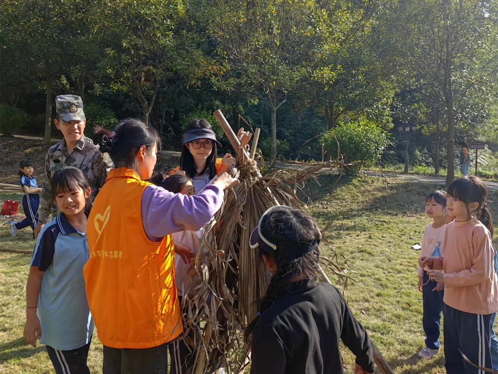 随后,党员志愿者们指导孩子们进行了木屋搭建、射箭活动等,进一步提升了孩子们的野外求生知识,提升了身体素质、技能。