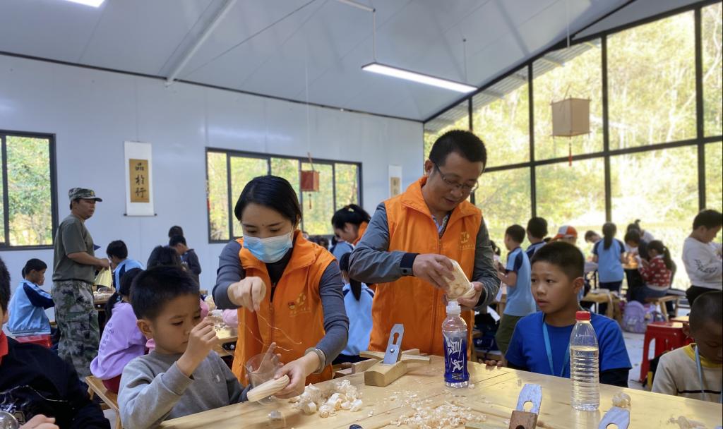 志愿者指导学生制作传统工艺品